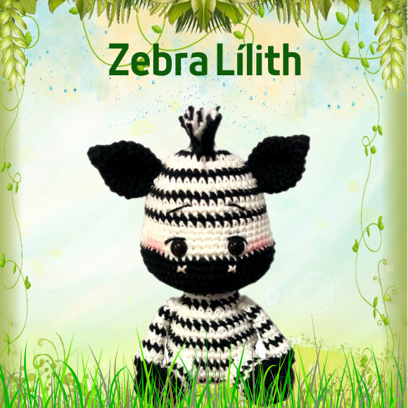 A Zebra Lilith Baby se destaca pelas listras características e pelo formato fofo, com uma cabeça arredondada, orelhas e cauda detalhadas, além de um focinho simpático. O passo a passo é bem estruturado, com imagens que auxiliam o processo de confecção, desde o corpo e cabeça até as patas e os detalhes das listras que tornam a zebra única.